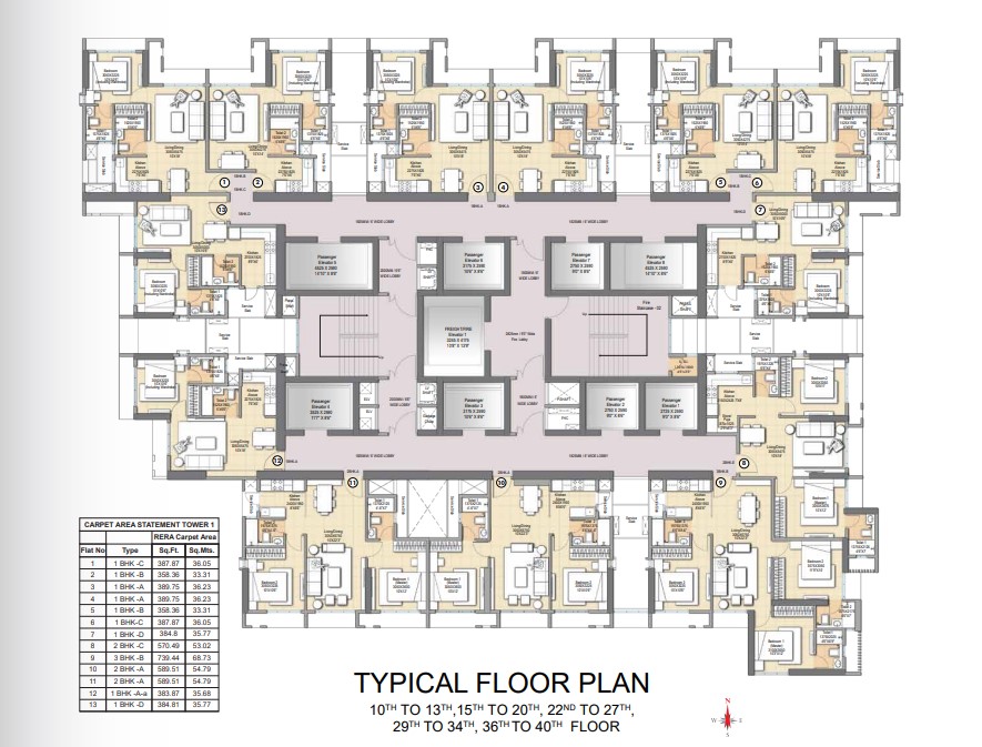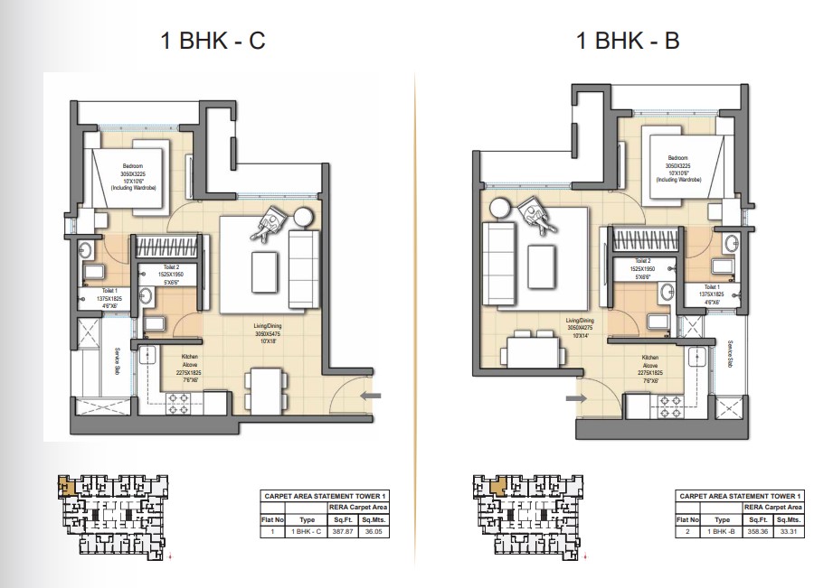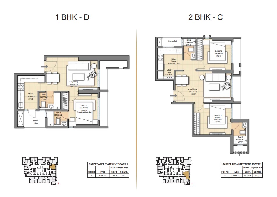 Carpet Area: 1BHK - 387 & 392 Sq Ft, 2BHK - 570, 578, 785 & 592 Sq Ft, 3BHK - 785 & 787 Sq Ft