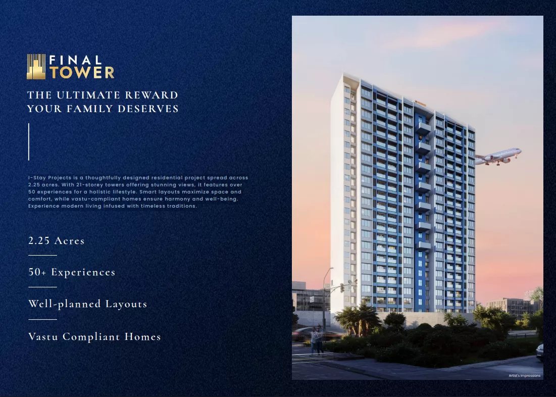Starwing Developers present the last tower at I-Stay in Marol Andheri East, Projects is a thoughtfully designed residential project spread across 2.25 acres. The project with 21-storey towers offering stunning views, it features over 50 experiences for a holistic lifestyle. Smart layouts maximize space and comfort, while vastu-compliant homes ensure harmony and well-being. Experience modern living infused with timeless traditions.