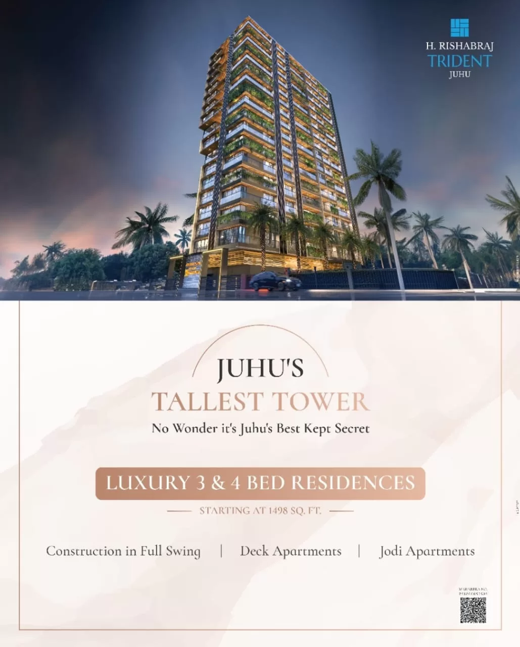 Rishabraj Realty Proudly presenting Rishabraj Trident in the vibrant location of Juhu JVPD near Gulmohar 10th number road. Project Rishabraj Trident offering large size 3BHK and 4BHK deck apartments with modern-day amenities with excellent connectivity and easy accessibility for schools, colleges, joggers park, high end hotel, surrounded by lots of greenery and neighbourhood of big corporates and Bollywood personalities.