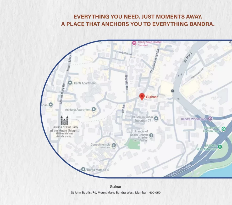 PCPL Gulnar is the brand new residential project coming at Mount Mary in Bandra West, one of the most finest and posh location of Mumbai City, PCPL Gulnar at Mount Mary offering the beautiful layout of 3BHK residences. PCPL Gulnar rises above the suburb, offering breathtaking views of the Arabian Sea and the Bandra skyline. Designed for those who appreciate life beyond the rush, it is more than just a home it is a space where time slows, where conversations linger, and where every moment between milestones is just as meaningful as the milestones themselves.