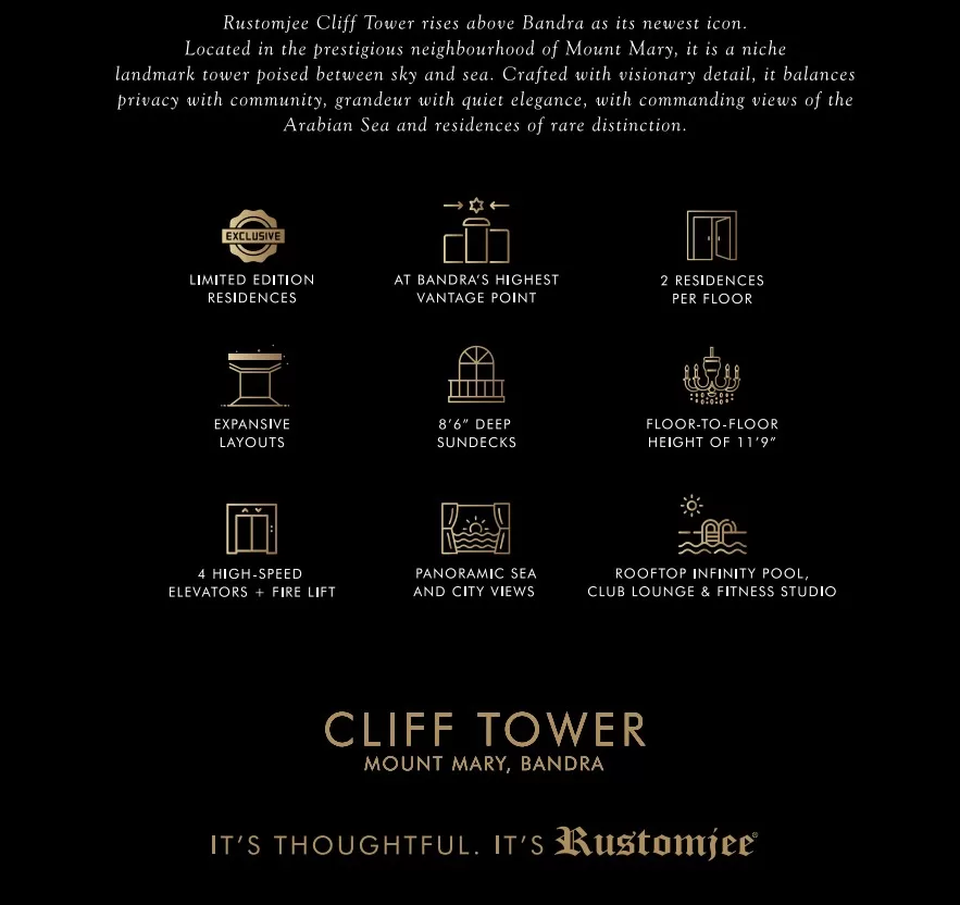 Rustomjee Cliff Tower is a masterpiece of modern architecture, offering a unique blend of luxury, privacy, and exclusivity. With its premium residences, stunning views, and serene setting, this tower is the ultimate destination for those who demand the best.