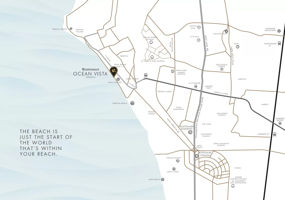 Rustomjee Ocean Vista Versova, where luxury meets peace in the heart of the Mumbai City. Located in the prestigious and most vibrant location of Versova neighbourhood, this exclusive beachfront address promises a supreme living experience.  This exclusive place offers residents direct access to the beach, allowing them to enjoy mesmerizing sunset views right from their balconies.