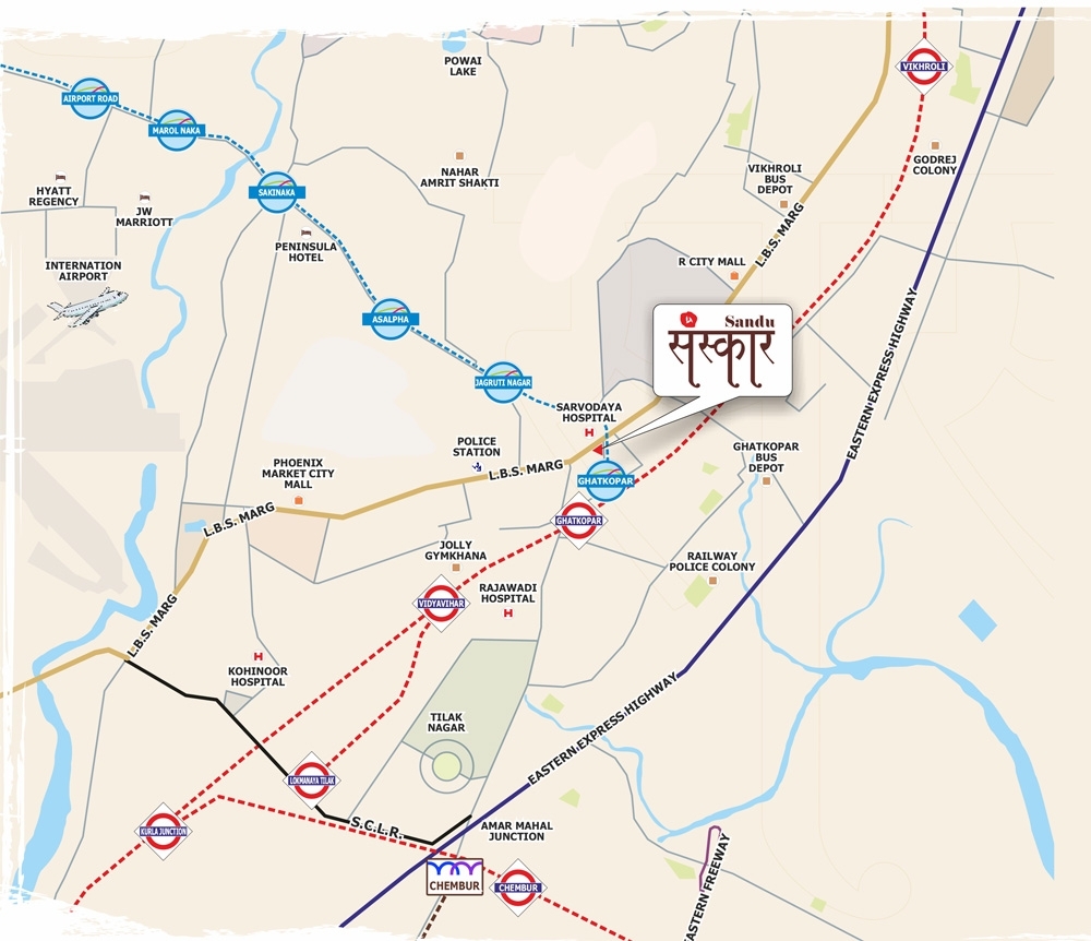 Ghatkopar is a perfect blend of contemporary & traditional culture. The surrounds of Sandu Sanskar at Ghatkopar are a sight to behold & filled with life & vibrancy. Mumbaikars now can enjoy the convenience of the Ghatkopar METRO & SUBURB Railway station, which is next to their doorstep. From the famous eating junction KHAOGALLI to Mumbai’s Favorite mall RCITY, Ghatkopar has a vivid identity unto its own. Equally at home are the spectacular theatres like PVR & BIG CINEMAS, health clubs like JOLLY GYMKHANA, all within easy reach. Add into the mix, the business & financial hubs like BKC, Powai & Thane are also very close thus making Sandu Sanskar your perfect address to relish the ultimate bliss of convenience.