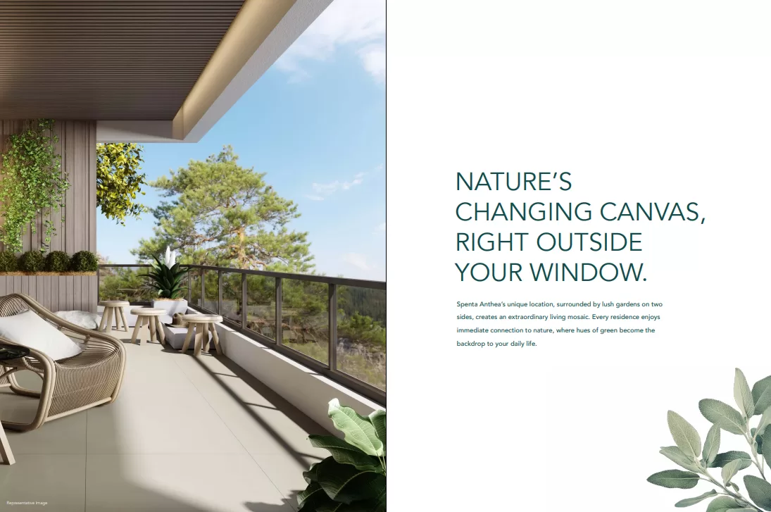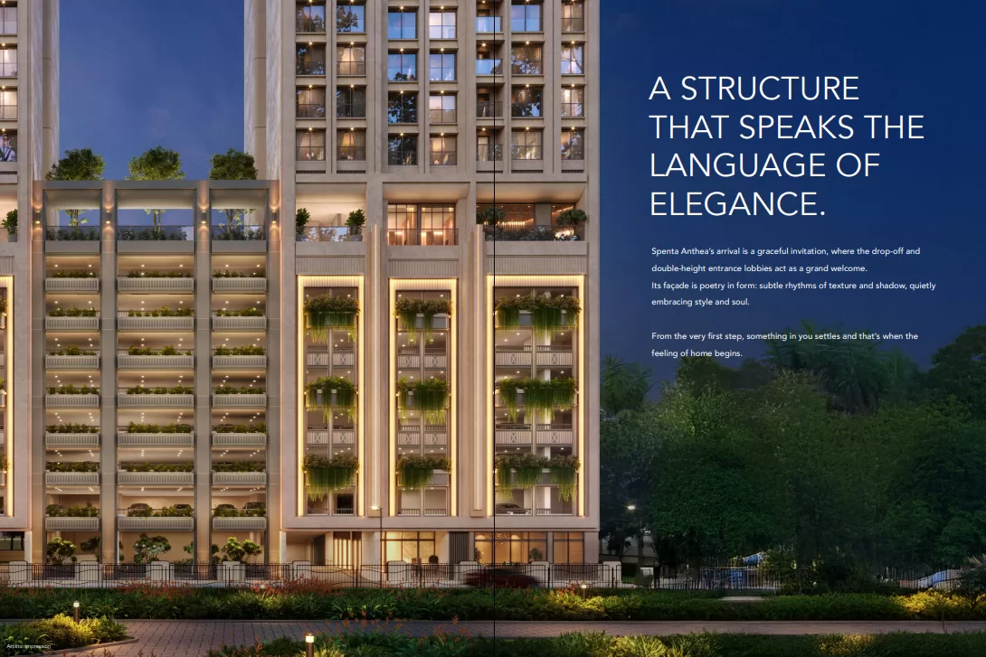 Spenta Anthea’s arrival is a graceful invitation, where the drop-off and double-height entrance lobbies act as a grand welcome. Its façade is poetry in form: subtle rhythms of texture and shadow, quietly embracing style and soul. From the very first step, something in you settles and that’s when the feeling of home begins. At Spenta Anthea, every layout is crafted with an intuitive flow where natural light pours through floor-to-ceiling windows and Vaastu’s wisdom guides positive energy. Residences extend to private balconies that effortlessly blur the indoors with gardens and horizons. Spenta Anthea’s unique location, surrounded by lush gardens on two sides, creates an extraordinary living mosaic. Every residence enjoys immediate connection to nature, where hues of green become the backdrop to your daily life
